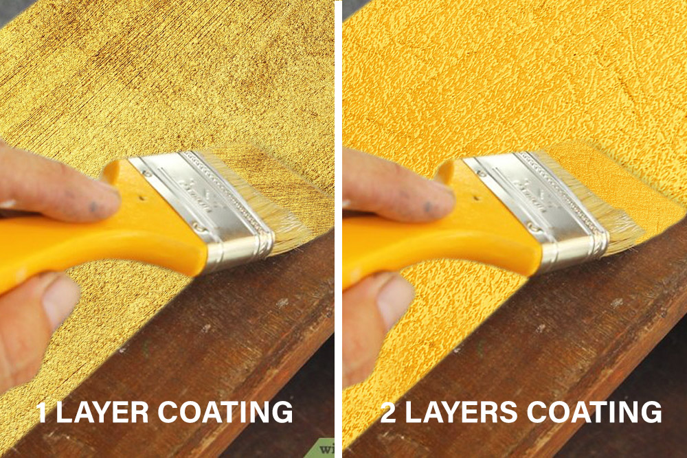 You may consider using more than 2 coatings with top coat for optimum results. It’s recommended to use a layer of Sealer/Primer and Top Coat the gold paint. (Minimum 2 coats) recoating time 2-3 hours